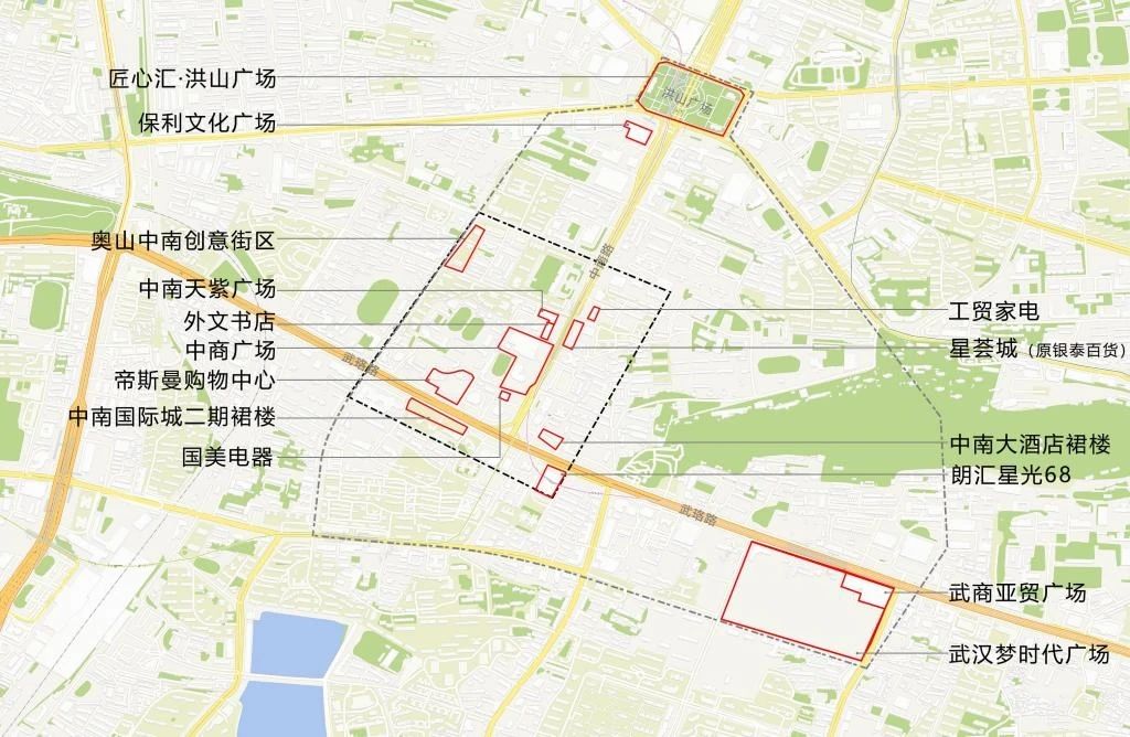 商圈范围:核心区域为沿中南路北至中南二路,沿武珞路西至傅家坡客运站、东至傅家坡二路区域。整体区域为沿中南路北至洪山广场,沿武珞路西至傅家坡客运站、东至石牌岭路区域。