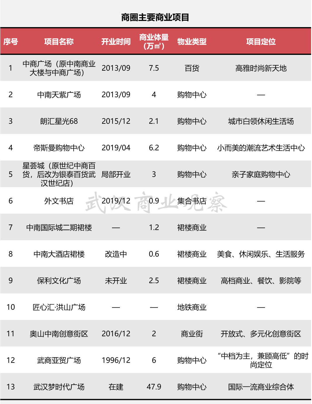 商圈集中商业主要布局于中南路南段及中南路与武珞路交汇区域,包括中商广场、中南天紫广场、星荟城、帝斯曼购物中心、朗汇星光68五个项目,商业体量约22.8万方,以大众型消费档次为主。