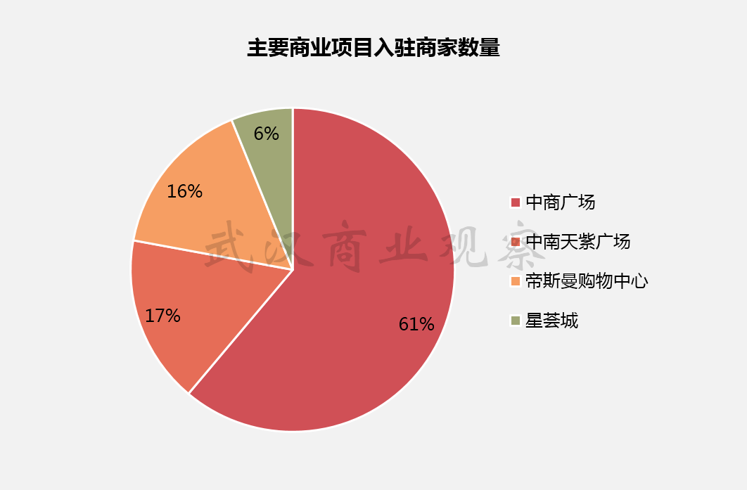 商圈中中商广场、中南天紫广场、帝斯曼购物中心、星荟城四个主要集中商业当前入驻商家约591家,其中中商广场约358家,占比约61%,长期以来都是商圈主力项目。中南天紫广场与帝斯曼购物中心的入驻商家数量接近,占比约16-17%。星荟城当前还处在招商阶段,商家数量不多。
