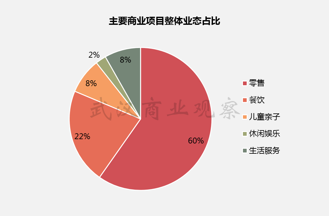 四个商业项目的入驻商家中,除超市便利店外,零售业态占比约60%,餐饮业态占比约22%,儿童亲子业态占比约8%,休闲娱乐业态占比约2%,生活服务业态占比约8%。整体呈现较为传统的商圈业态结构。