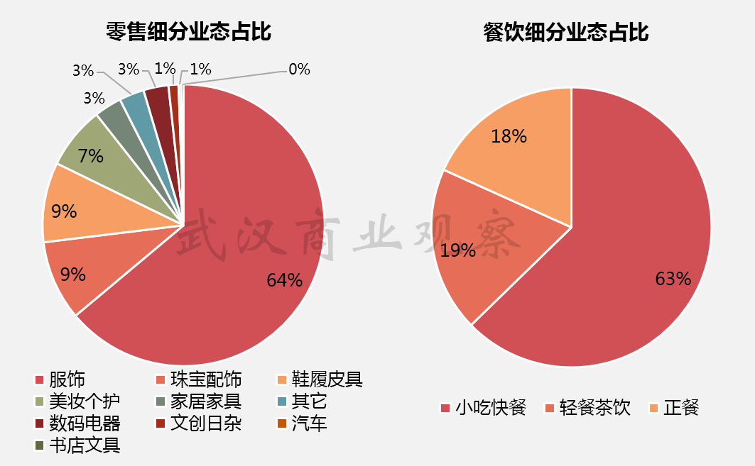 按照细分业态来看,零售业态中,服饰、珠宝配饰、鞋履皮具占比超过82%,呈现明显的百货购物特征。餐饮业态中,小吃快餐占比63%,反映出商圈滑落为白领、学生“食堂”的现象。