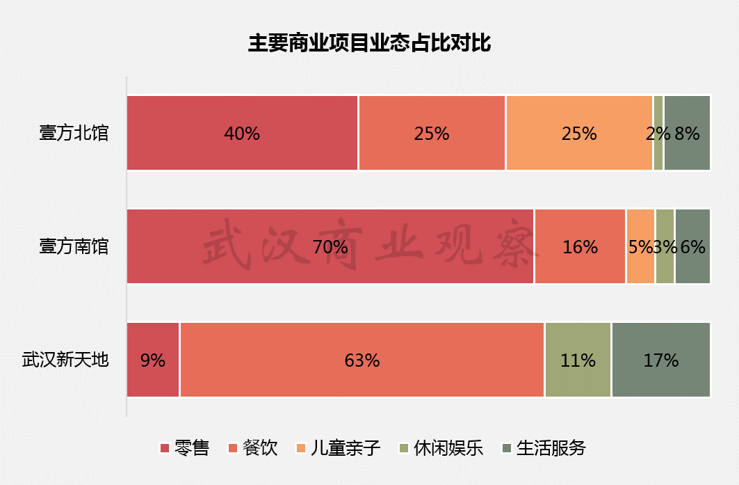 三个主要商业项目横向对比来看,差异定位、业态互补的特征十分明显,武汉新天地自开业之初就保持着超过55%的餐饮业态占比,在壹方南馆开业之后,餐饮业态占比更进一步调高。壹方南馆则以零售业态为主,并进一步丰富区域的餐饮、休闲娱乐业态类型和品牌。壹方北馆儿童亲子业态占比达到25%,其他业态的品牌也侧重于家庭、生活消费。