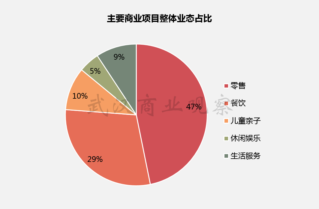 商圈中武汉新天地、壹方南馆、壹方北馆三个主要集中商业总体入驻商家约435家,除超市便利店外,零售业态占比约47%,餐饮业态占比约29%,儿童亲子业态占比约10%,休闲娱乐业态占比约5%,生活服务业态占比约9%。整体业态组合丰富,结构较为均衡。